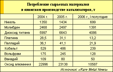 | Потребление сырья японскими производителями катализаторов в 2006 году | ![]() |