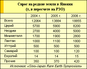 Спрос на редкие земли в Японии с 2004 г. поддерживался на высоком уровне. В 2005 г. он вырос на 15% - до 13884 т (в пересчете на оксиды редкоземельных металлов - РЗО), превысив предыдущий максимум, зафиксированный в 2000 г. По предварительной оценке, в 2006 г. рост спроса составил 36% (до 18855 т РЗО), причем повышение отмечалось для всех редкоземельных продуктов, кроме иттрия. Наиболее значительно увеличилось потребление лантана в производстве оптического стекла и керамических конденсаторов (на 64%), а также церия в производстве абразивов для жидкокристаллических дисп¬леев, полупроводников и стойкого к ультрафиолетовому облучению стекла (на 39%).