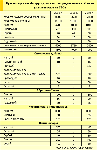 По прогнозу «Advanced Materials Japan» («AMJ»), в более отдаленной перспективе - до 2010 г., вдвое увеличится потребление редких земель в производстве неодим-железо-боровых магнитов и никель-металл-гидридных аккумуляторных батарей, при этом среднегодовой прирост составит 15%. Спрос со стороны продуцентов абразивов, стекла и керамических конденсаторов будет расти более медленными темпами. В производстве электроннолучевых трубок ожидается его снижение на 20%.