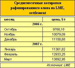 Вследствие резкого обострения положения с поставками рафинированного олова его цены с осени 2006 г. существенно возросли. Только за февраль 2007 г. металл на ЛБМ подорожал почти на $2000 за т, и 26 февраля котировка «сеттлмент» достигла $13700 за т, или наиболее высокого уровня за последние 20 лет. По оценке Т. Мерата, эксперта «Credit Suisse» (г. Цюрих), цены олова будут продолжать расти, а «положение с поставками до конца года останется крайне напряженным».