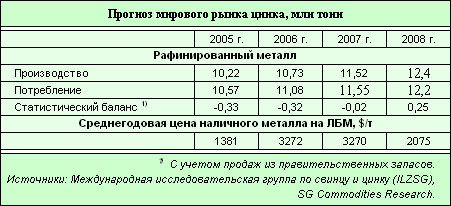 По оценке Международной исследовательской группы по свинцу и цинку, дефицит поставок рафинированного цинка в текущем году снизится до 40 тыс. т с 320 тыс. в 2006 г. Избыток поставок на рынке в 2008 г. может, по прогнозу Societe Generale, достигнуть 250 тыс. т.
