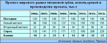 По прогнозу "Sumitomo Titanium", на мировом рынке титановой губки, используемой для производства титанового проката, до 2008 г. сохранится напряженность с поставками. В 2010/11 г. поставки должны превысить спрос на 10 тыс. т, но с 2012 г. ситуация с наличием металла на рынке вновь обострится.