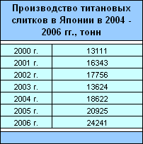 Производство титановых слитков в Японии в 2004 - 2006 гг. последовательно увеличивалось после существенного сокращения в 2003 г. и в последние годы характеризовалось следующими данными: