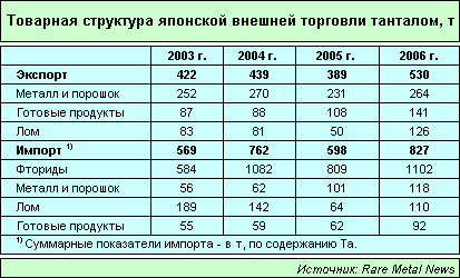 Отгрузки из Японии танталового порошка и металлического тантала увеличились в 2006 г. на 14% -до 264 т ввиду перемещения за рубеж предприятий по выпуску конечных продуктов компаний "Cabot Super Metals" и "Н. С. Starck".