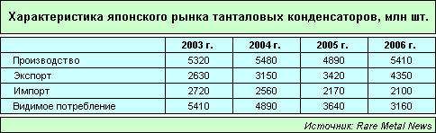 Производство танталовых конденсаторов в Японии повысилось в 2006 г. на 11% - до 5410 млн. шт. вследствие высокого экспортного спроса на указанные продукты, используемые в национальном производстве электронного оборудования. Японский экспорт танталовых конденсаторов вырос в 2006 г. на 27% -до 4350 млн. шт., в результате чего в стране наблюдался резкий рост потребления танталового порошка.