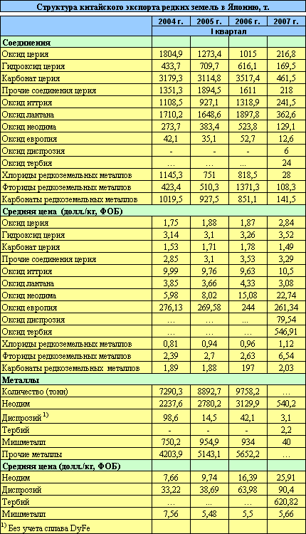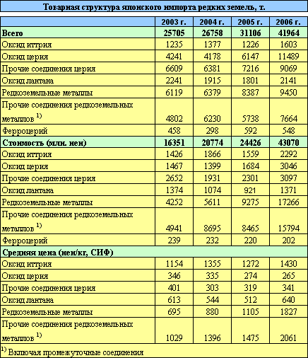 По данным японских источников (показатели несколько отличаются от приведенных выше), ввоз редкоземельных металлов в Японию в 2006 г. достиг рекордного уровня в 9450 т. В стоимостном выражении японский импорт этих металлов вырос на 86% - до 17,3 млрд. иен, а их средняя импортная цена повысилась на 65% - до 1827 иен/кг. Рост импорта был обусловлен ожидаемым введением экспортных пошлин в КНР и повышением спроса на редкоземельные металлы в Японии. Спрос на редкоземельные металлы повысился и в Китае. Увеличение спроса на содержащие редкие земли водороднакопительные сплавы, используемые в никель-металл-гидридных аккумуляторных батареях, и на неодим-железо-боровые спеченные магниты был вызван увеличением продаж гибридных электромобилей.