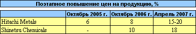 Вследствие этого японские продуценты спеченных неодим-железо-боровых магнитов - "Hitachi Metals" и "Shinetsu Chemicals" провели поэтапное повышение цен на свою продукцию в августе 2005 г., августе 2006 г. и феврале 2007 г. (действовавшие с октября 2005 г., октября 2006 г. и апреля 2007 г.) в следующих масштабах (%):