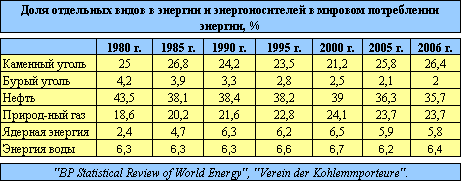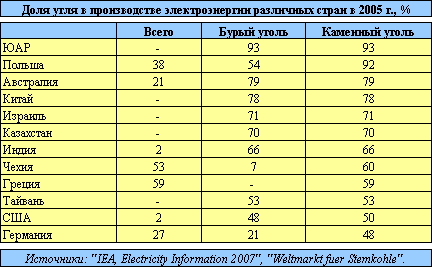 В 2004 г. за счет угля обеспечивалось не менее 26% мировых потребностей в первичной энергии. Согласно прогнозу "Energy Information Administration" ("EIA"), к 2030 г. доля угля в мировом потреблении энергоносителей составит около 28%, а в производстве электроэнергии - примерно 45% (в 2004 г. - 43%). В настоящее время уголь имеет ценовые преимущества перед нефтью и природным г.азом.