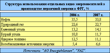 В 2007 г. по сравнению с 2006 г в ФРГ, несмотря на экономический рост производство энергии выросло всего на 25 млн. т у. э. (одна тонна угольного эквивалента (т у. э.) соответствует одной тонне условного топлива (т у. т.) и составляет 7 млн. ккал). Специалисты связывают это с увеличением цен на энергоносители и температурой окружающей среды в зимние месяцы, которая была выше климатической нормы. В производстве первичной энергии доля каменного угля в общем потреблении энергоносителей в стране выросла на 1,5%. Он использовался в основном для выработки тепловой и электроэнергии, а также в производстве стали.