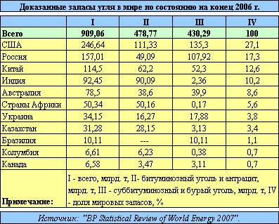 По состоянию на конец 2006 г. извлекаемые запасы угля в мире оценивались примерно в 909 млрд. т, из них более 66% были сосредоточены в четырех странах (%): США -27, Россия - 17, Китай - 12,6 и Индия - 10.