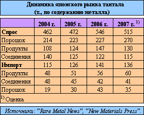 Крупным потребителем и импортером тантала является также Япония, где, по данным "Japan Newer Metals Association", спрос на него в 2006 г. увеличился на 16% - до 546 т, по содержанию металла. При этом на танталовые продукты и порошок спрос достиг рекордных показателей, превысив уровень 2000 г. - периода бума на рынке информационных технологий. Теперешний рост был вызван повышением спроса на рассеивающие мишени и конденсаторы, используемые в цифровых потребительских товарах. Однако ожидалось, что в 2007 г. спрос на тантал в Японии снизится вследствие отмечавшегося в начале года сокращения производства продуктов электронной промышленности.