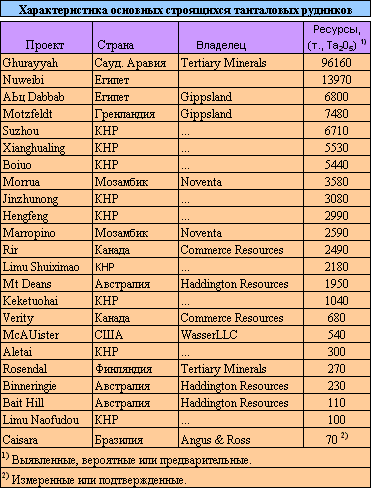 В мировой танталодобывающей промышленности в настоящее время имеется целый ряд проектов строительства новых рудников. На западе Саудовской Аравии британская компания "Tertiary Minerals pic" продолжает работы на крупном месторождении тантала Ghurayyah. Вероятные ресурсы здесь превышают 95 тыс. т Та2О5 и 1 млн. т Nb2O5, чего достаточно для добычи в течение более чем 200 лет.