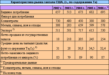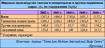 По данным Брюссельского международного исследовательского центра тантала и ниобия ("TIC"), в 2000 г. мировой спрос на тантал вырос более чем до 2,7 тыс. т, вызвав нехватку поставок концентратов, повлекшую за собой резкий рост их цен. Однако в 2001 г спад в мировой экономике вызвал падение спроса на тантал примерно до 1,8 тыс. т, при этом цены вновь понизились. В 2005 - 2006 гг. спрос на этот металл, по-видимому, вышел из наблюдавшегося в течение предыдущих лет состояния стагнации, продемонстрировав постепенный рост. Предшествовавший ему спад на рынке, по-видимому, был вызван главным образом прерыванием традиционных долгосрочных контрактов на поставку танталовых сырьевых материалов их продуцентами перерабатывающим компаниям, в результате которого последние были вынуждены расходовать свои складские запасы.