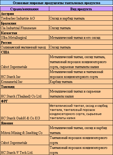 Основными покупателями и пе-реработчиками танталовых сырьевых материалов в мире являются две компании - "НС Starch GmbH" (с предприятиями в ФРГ, Таиланде, США и Японии) и "Cabot Corp." (с предприятиями в США и Японии). В число других перерабатывающих компаний входят китайские "Ningxia Non-ferrous Metals Import and Export Corp.", "Jiujang Tanbre Smelter", "Jiujang Jinxin Non-ferrous Metals Co Ltd." и ряд других базирующихся в КНР фирм, а также эстонская "AS Silmer", японская "Mitsui Mining and Smelting Co Ltd.", казахстанская "NAC Kazatomprom" и российская "Соликамский магниевый завод".