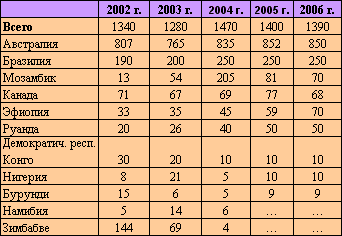 Следует отметить, что данные Геологической службы США существенно отличаются от приведенных выше. Так, по оценке американских экспертов, мировая добыча тантала в 2006 г. лишь незначительно снизилась по сравнению с 2005 г., при этом ее географическая структура в последние годы характеризовалась следующими данными (т, по содержанию Та):