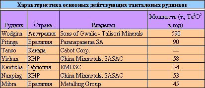 По данным "Tantalum-Niobium International Study Centre", в 2006 г. мировое первичное производство тантала сократилось по сравнению с 2005 г. на 32%, в основном вследствие закрытия подземного рудника на австралийском месторождении Greenbushes (вероятно, этот факт не был учтен в оценках Геологической службы США). Оно ранее принадлежало лидеру мировой добычи тантала - австралийской компании "Sons of Gwalia Ltd.", которая с 2004 г. находилась под административным управлением. В июне 2007 г. было одобрено приобретение ее подразделения "Advanced Minerals Division" консорциумом инвесторов, руководимым специализирующимся на добыче ископаемых фондом "Resource Capital Fund IV LP" со штаб-квартирой в Денвере. В августе 2007 г. принадлежащие "Sons of Gwalia" ресурсы тантала, оставаясь на сегодняшний день крупнейшим в мире источником этого металла, перешли к вновь созданной компании "Talison Minerals Pty Ltd.". Все активы компании располагаются в шт. Западная Австралия и включают танталовый рудник "Wodgina", литий-тантало-оловянный рудник "Greenbushes" и ряд высокоперспективных разведываемых участков вблизи "Wodgina".
