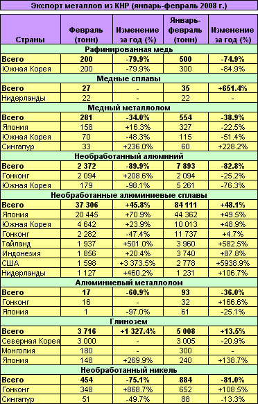| Статистика внешней торговли КНР цветными металлами в январе-феврале 2008г. (Экспорт) | ![]() |