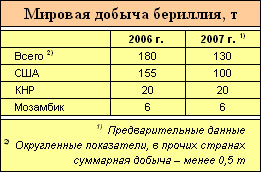 Мировая добыча бериллия, по предварительной оценке Геологи¬ческой службы США, снизилась в 2007 г. на 1/3 по сравнению с 2006 г. – до 130 т, что было вызвано сокращением производства в США, яв¬ляющихся доминирующим в мире продуцентом этого металла и его нетто-экспортером.