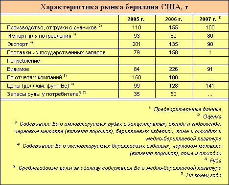 В первом полугодии 2007 г. продажи продуктов из медно-бериллиевых сплавов лидирующего американс¬кого продуцента снизились по срав¬нению с тем же периодом 2006 г., а бериллий-оксидной керамики оста¬лись стабильными. Продажи бериллиевых продуктов для военной промышленности, медицины и про¬изводства промышленного рентге¬новского оборудования, а также бериллий-алюминиевых продуктов в указанный период увеличились. В 2007 г. компания продолжала по¬ставлять чистый бериллий в Евро¬пу для строительства эксперимен¬тального термоядерного реактора.