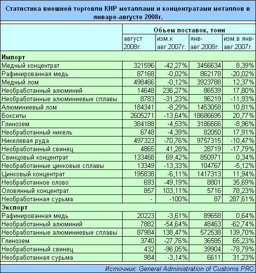 | Таможенная статистика КНР по цветным металлам за август 2008 года | ![]() |