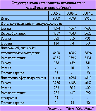 Как сообщает "Roskill's Letters from Japan", в 2007 г. ввиду подорожания металла японский импорт порошкового и чешуйчатого никеля в стоимостном выражении вырос по сравнению с 2006 г. на 84% - до 35,6 млрд. иен CIF Япония. В отличие от этого в количественном выражении он уменьшился на 4% - до 8710 т вследствие 15%-ного сокращения национального производства никель-кадмиевых аккумуляторных батарей (до 259 млн. шт.) и 7%-ного снижения выпуска в стране никель-металл-гидридных батарей (до 305 млн. шт.). Никелевый порошок используется для изготовления положительных электродов аккумуляторных батарей на базе никеля.