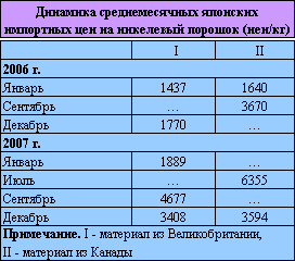Японский импорт никелевого порошка для производства батарей и мишеней, а также для порошковой металлургии снизился в 2007 г. на 5% - до 3894 т, в основном за счет сокращения поставок из Великобритании. Динамика среднемесячных японских импортных цен на никелевый порошок характеризовалась следующими данными (иен/кг):