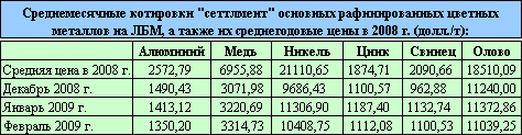 Алюминий. В январе 2009 г. 7-й месяц подряд отмечалось снижение среднемесячных цен на алюминий, при этом по сравнению с декабрем 2008 г. металл подешевел на 5,18%. По сравнению с январем 2008 г. алюминий подешевел на 42,21%, а объем его складских запасов на ЛБМ вырос почти в 3 раза. Наблюдавшееся в последние месяцы резкое снижение цен на металл сопровождалось быстрым увеличением его складских запасов на ЛБМ (с 1,12 млн. т в начале августа 2008 г. до 2,32 млн. к концу декабря того же года и до 2,81 млн. в начале февраля 2009 г.). За январь 2009 г. данный показатель повысился почти на 20%.