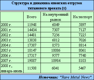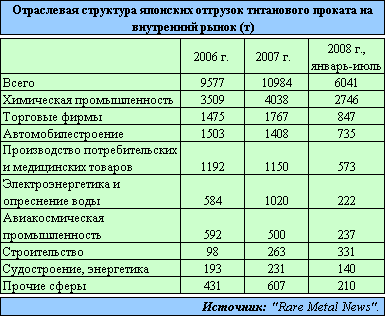 Ранее прогнозировалось, что в 2008 г. японские отгрузки титанового проката на внутренний рынок страны увеличатся на 5%. Однако в действительности за первые 7 месяцев прошлого года они сократились на 7% - до 6041 т. С недавнего времени японские продуценты металлического титана в значительной степени переключили свое внимание с авиакосмического рынка сбыта на другие сферы потребления их продукции с тем, чтобы исключить негативное влияние цикличности, свойственной авиакосмической промышленности. Однако на других рынках продуценты товаров вследствие напряженности с поставками титана и ввиду его высоких цен в значительной степени перешли от использования титана к применению нержавеющей стали. В результате за первые 7 месяцев 2008 г. японские суммарные отгрузки титанового проката национальным потребителям и торговым фирмам снизились по сравнению с тем же периодом 2007 г. на 7%.