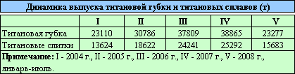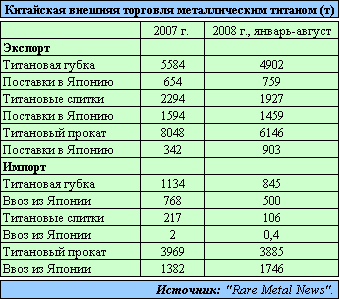 По сообщению "China General Customs Administration", в Китае в результате наблюдавшегося в 2007 г. роста производства титановой губки повысился выпуск металлического титана во всех формах и страна стала его нетто-экспортером. В январе-августе 2008 г. китайский нетто-экспорт титановой губки составил 4902 т, при этом отгрузки в Японию увеличились по сравнению с тем же периодом 2007 г. на 55% - до 759 т, тогда как японские поставки в КНР снизились на 4% -до 500 т. Таким образом, впервые в рамках двусторонней торговли между этими странами КНР стала нетто-экспортером титановой губки, при этом ее нетто-экспорт составил 259 т.
