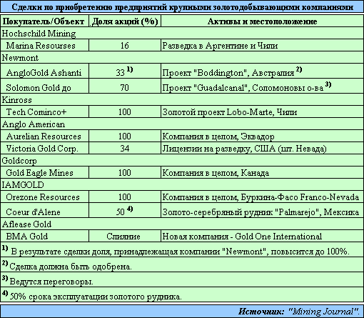 За последние три месяца 2008 г. - первые два месяца 2009 г. осуществлялись следующие сделки по приобретению таких предприятий крупными золотодобывающими компаниями: