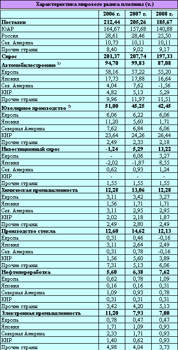 Мировой рынок платины в 2008 году по данным "Johnson Matthey", характеризовался дефицитом поставок в 11,66 т. При этом нетто-спрос на металл снизился на 5% - до 197,49 т, а его предложение - на 9,5% - до 185,67 т.
