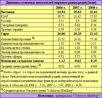 На мировом рынке родия после наблюдавшегося в предыдущие четыре года дефицита в 2008 г. сформировался небольшой по величине избыток поставок металла, составивший, по данным "Johnson Matthey", 0,19 т. Изменение в характере баланса спроса и предложения было обусловлено падением нетто-спроса на родий в мире на 18,4% (до 21,42 т) при менее значительном сокращении мировых поставок первичного металла (на 15,7% - до 21,61 т).