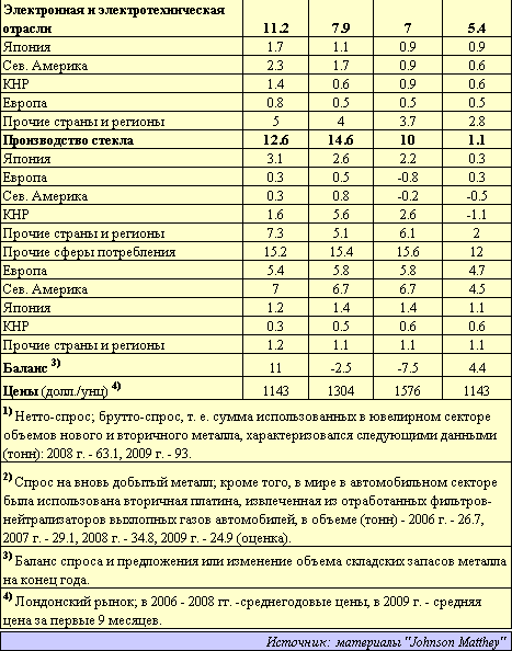 В 2009 г. впервые с 2002 г. глобальный нетто-спрос на платину со стороны автомобилестроения, по оценке, оказался ниже, чем в ювелирной промышленности, а брутто-спрос в этих секторах почти сравнялся, тогда как в предыдущие три года они разнились примерно в 2,5 - 3,0 раза.