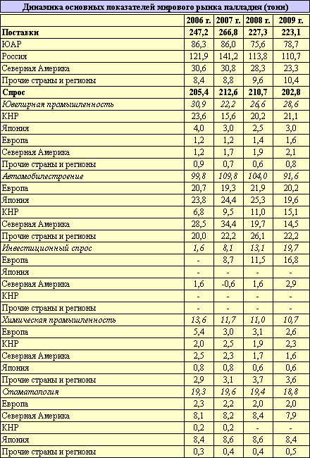 По оценке компании "Johnson Matthey", мировой рынок палладия в 2009 г. характеризовался избытком поставок в 20,3 т, тогда как еще два года назад последний определялся в 54,2 т. Уменьшение дисбаланса между спросом и предложением на рынке этого металла в истекшем году происходило в условиях сокращения как поставок, так и спроса на палладий, однако снижение предложения в 2008 г. по сравнению с уровнем 2007 г. было более значительным.