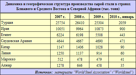 Крупнейшим продуцентом сырой стали на Ближнем и Среднем Востоке и в Северной Африке является Турция, где выпуск этого металла в 2009 г. равнялся 25,3 млн. т. В остальных странах данного региона суммарное производство стали примерно равняется турецкому, что немногим больше 2% ее мирового выпуска.