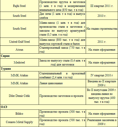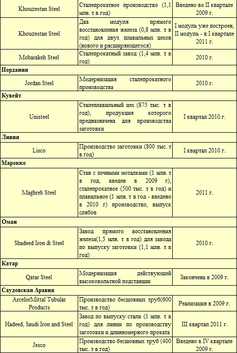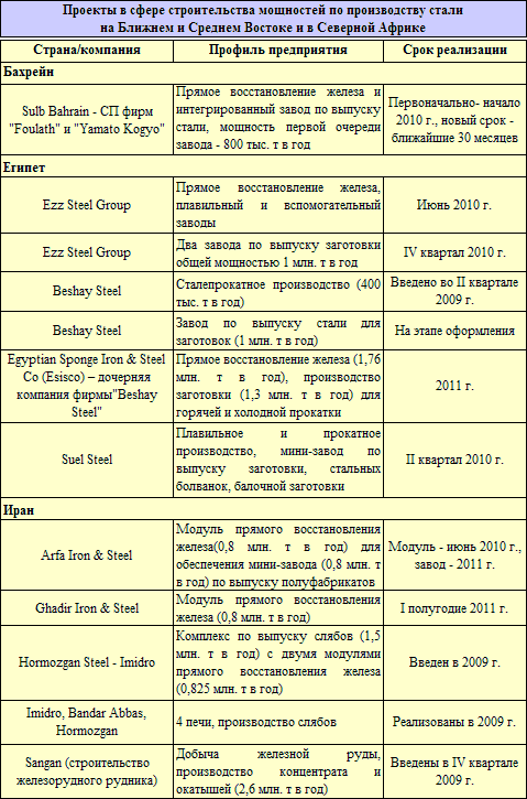 своих проектов, при этом реализация наиболее амбициозных была отложена, а часть из них будет осуществляться более медленно, чем планировалось ранее; тем не менее ряд проектов, в частности компании "Erbil Steel" в Ираке и множества более мелких продуцентов в Египте, Иордании и Сирии, будут продвигаться в реализации своих проектов благодаря активному спросу на сталь на внутренних рынках этих стран и улучшению ситуации с финансированием.