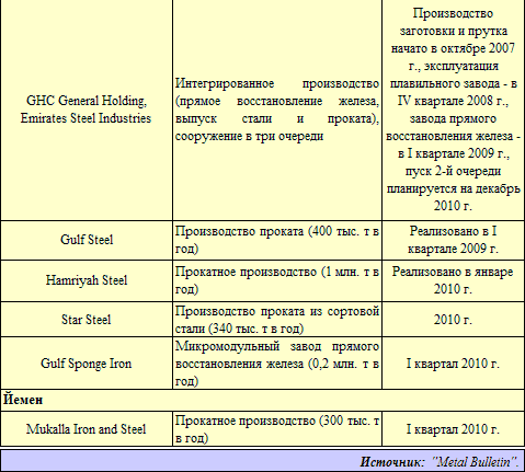 В 2009 г. на рынках стран - членов "Gulf Cooperation Council" ("GCC") появились новые участники рынка. Так, "Star Steel" и "United Gulf Steel" ("UGS") в Дубае приобрели мощности по вторичной прокатке стали, a "Emirates Steel Industries" ("ESI") начала эксплуатацию первого в ОАЭ крупного предприятия по прямому восстановлению железа и производству стальной заготовки, расположенного в Абу-Даби Ожидается, что расширение мощностей в ОАЭ продолжится, в частности, "Hamriyah Steel" и "Conares Metal Supply" предполагают в 2010 г. ввести в строй дополнительные мощности по вторичной прокатке стали в объеме 1,4 млн. т в год.