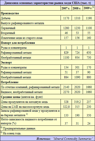 В США, третьем крупнейшем в мире продуценте меди, на 2009 г. первоначально прогнозировался рост добычи меди более чем на 200 тыс. т, однако в действительности указанный показатель снизился на 120 тыс. т, или примерно на 9%, - до 1,2 млн. т (на сумму около 6,2 млрд. долл.) вследствие существенного пересмотра несколькими компаниями своих производственных планов, включая закрытие рудников, введенных в эксплуатацию в 2008 г.