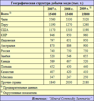 Мировая добыча меди в 2009 г., по предварительной оценке Геологической службы США, увеличилась по сравнению с 2008 г. на 2,6% - до 15,8 млн. т, при этом ее географическая структура была следующей (тыс. т):