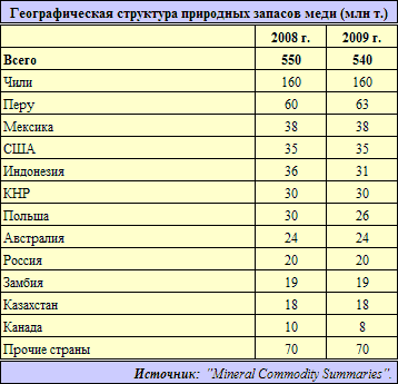 Мировые природные запасы меди на конец 2009 г., по оценке Геологической службы США, составили 540 млн. т, а их географическая структура была следующей (млн. т):