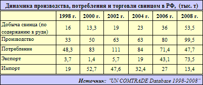 В 90-е годы в России не хватало собственного рафинированного свинца, поскольку на фоне кризисных явлений и трансформаций, наблюдавшихся в экономике страны, резко уменьшились сбор и переработка вторичного свинецсодержащего сырья, а уровень первичного производства рафинированного металла оставался традиционно низким. В тот период основным поставщиком рафинированного свинца в Россию стал Казахстан. В результате Россия в 90-е годы, являлась нетто-экспортером таких основных металлов как алюминий, никель, медь и цинк, была нетто-импортером рафинированного свинца.