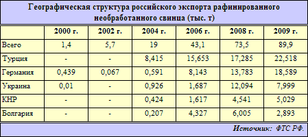 В экспортных отгрузках рафинированных свинца и цинка для России главным являются турецкий рынок, на который в 2009 г. приходилось 25% суммарного вывоза металла, и рынок Германии (20,6%). В крупных масштабах осуществлялись также поставки в страны СНГ (в 2009 г. - около 11%, в 2008 - 23%): в основном на Украину (8 тыс. т), Узбекистан (0,77 тыс.) и Казахстан (0,1 тыс.). В 2004 - 2008 гг. постепенно росла доля КНР - с 2,2 до 6,2%, однако в 2009 г. она уменьшилась до 5,6%.