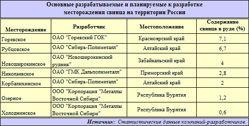 На протяжении длительного времени подавляющий объем добычи свинца в РФ обеспечивали два предприятия: ОАО "Горевский ГОК" и ОАО "ГМК Дальполиметалл". В последние годы в добыче свинца и производстве свинцовых концентратов появились новые участники - ОАО "Сибирь-Полиметалл" ("УГМК"), ООО "Корпорация "Металлы Восточной Сибири" (ИФК "Метрополь"), ОАО "Новоширокинский рудник" (СП ООО "Руссдраг-мет" и "Kazzinc"), а также ряд других компаний, способных резко наращивать экспортный потенциал отрасли.