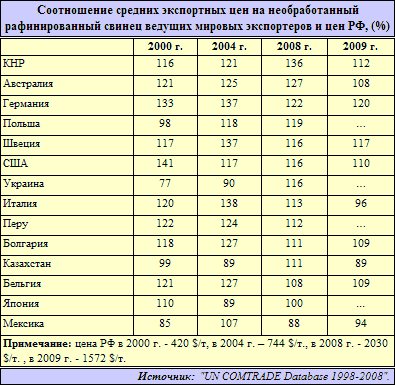 Рафинированный свинец из РФ уже в течение многих лет поступает на внешние рынки по ценам ниже среднемировых, но отмечается тенденция к постепенному приближению к последним. При этом в целом российский свинец лишь немного уступает в цене металлу, поставляемому из основных стран-экспортеров, и имеются потенциальные возможности повышения цен на российский металл до среднемирового уровня, в частности за счет позиций конкурентов из стран СНГ на мировом рынке.