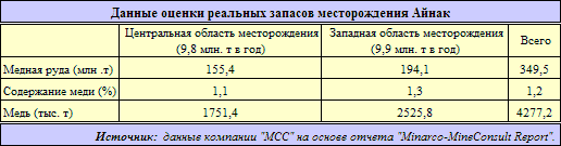 По данным неправительственной организации "Transparency International", Афганистан занимает второе место в мире по запасам меди. Медное месторождение Айнак (Aynak) расположено в пров. Логар в центральной части Афганистана, занимает площадь около 5 кв. км. Оно разделено на центральную и западную области, которые должны быть поэтапно освоены (западная область - после 2018 г.). Концессия на эксплуатацию месторождения представлена на 30 лет. Подготовка месторождения к эксплуатации может быть завершена в 2011 г. Годовой объем добычи и переработки составит 300 тыс. т электролитической меди, 100 тыс. т медного концентрата и 300 тыс. т серной кислоты. Проектные показатели производительности предприятия составляют около 60 тыс. т в сутки. Начало эксплуатации намечено на 2012 г., а выход на проектную мощность - на 2014 г. В дальнейшем запланировано создание медеплавильного производства.