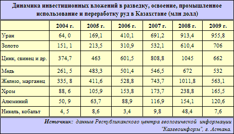 Однако в течение последних лет увеличились потребности в данном сырье со стороны ядерной энергетики. Так, если выпуск в 2007 г. составил 6,638 тыс. т, то в 2009 г. он вырос более чем в 2 раза. В 2010 г. Национальная атомная энергетическая компания "Казатомпром", основанная в 1997 г., планирует довести уровень производства урана до 18 тыс. т. "Казатомпром" является полностью государственной компанией и кроме урана производит редкие и редкоземельные металлы.