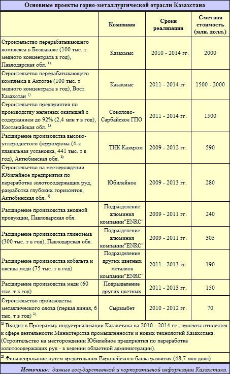 В настоящее время подготовлен план перспективного развития горно-обогатительного комплекса Казахстана, включающий в себя более 70 проектов с суммарным объемом инвестиций свыше 50 млн. долл. Около 1/10 этих проектов включены в правительственную Программу индустриально-инновационного развития Казахстана в период 2010 - 2014 гг. Для реализации средне- и долгосрочных проектов предусмотрено привлечение инвесторов. Кроме того, в восточном регионе страны запланировано создание исследовательского центра по изучению проблем горной и металлургической промышленности. Поставщиком лабораторного и другого оборудования будет Финляндия.