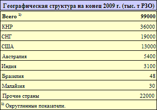 Глобальные природные запасы редкоземельного сырья на конец 2009 г. оцениваются Геологической службой США в 99 млн. т (в пересчете на оксиды редкоземельных металлов - РЗО), из которых 36% приходится на Китай. В целом их географическая структура на конец 2009 г. характеризовалась следующими данными (тыс. т РЗО):