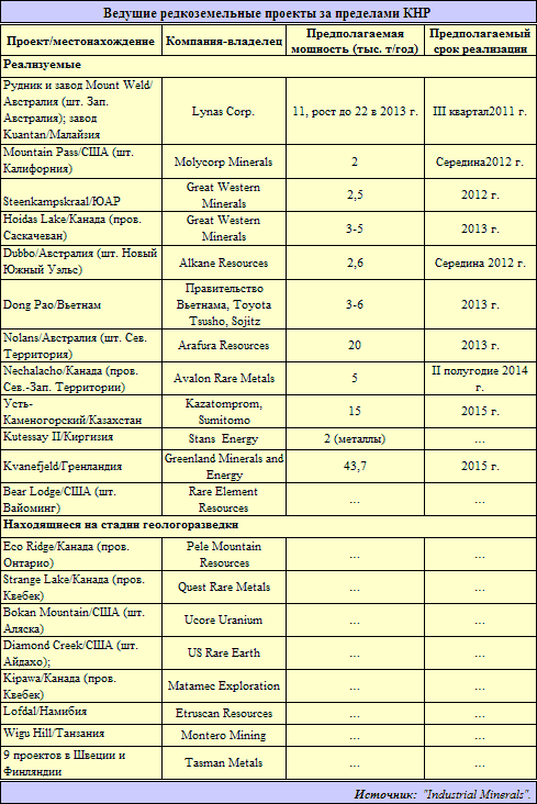 Однако в последнее время появились опасения относительно возможной нехватки поставок редкоземельного сырья из Китая, что способствовало активизации деятельности по формированию новых источников этих стратегических минералов в мире. В 2009 г. мировая редкоземельная отрасль развернула активную деятельность, направленную на ее заметное расширение за пределы Китая. Как отмечал "Industrial Minerals" в июне 2010 г., деятельность китайских экспортеров редких земель в предшествующие полтора года стала вызывать тревогу у потребителей.