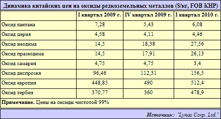 Цены на редкие земли в I квартале 2010 г. повысились в результате увеличения японского импорта (в 6 раз по сравнению с тем же периодом 2009 г.) и роста спроса со стороны продуцентов аккумуляторных батарей.